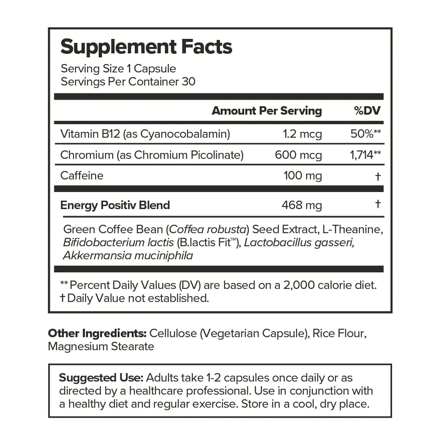 Serving Size: 2 capsules, 30 servings per container. V-Positiv Probiotic Blend®: Lactobacillus acidophilus, Lactobacillus rhamnosus, Lactobacillus reuteri, Lactobacillus fermentum 50 mg (5 Billion CFUs), Xylooligosaccharides (XOS) 400 mg