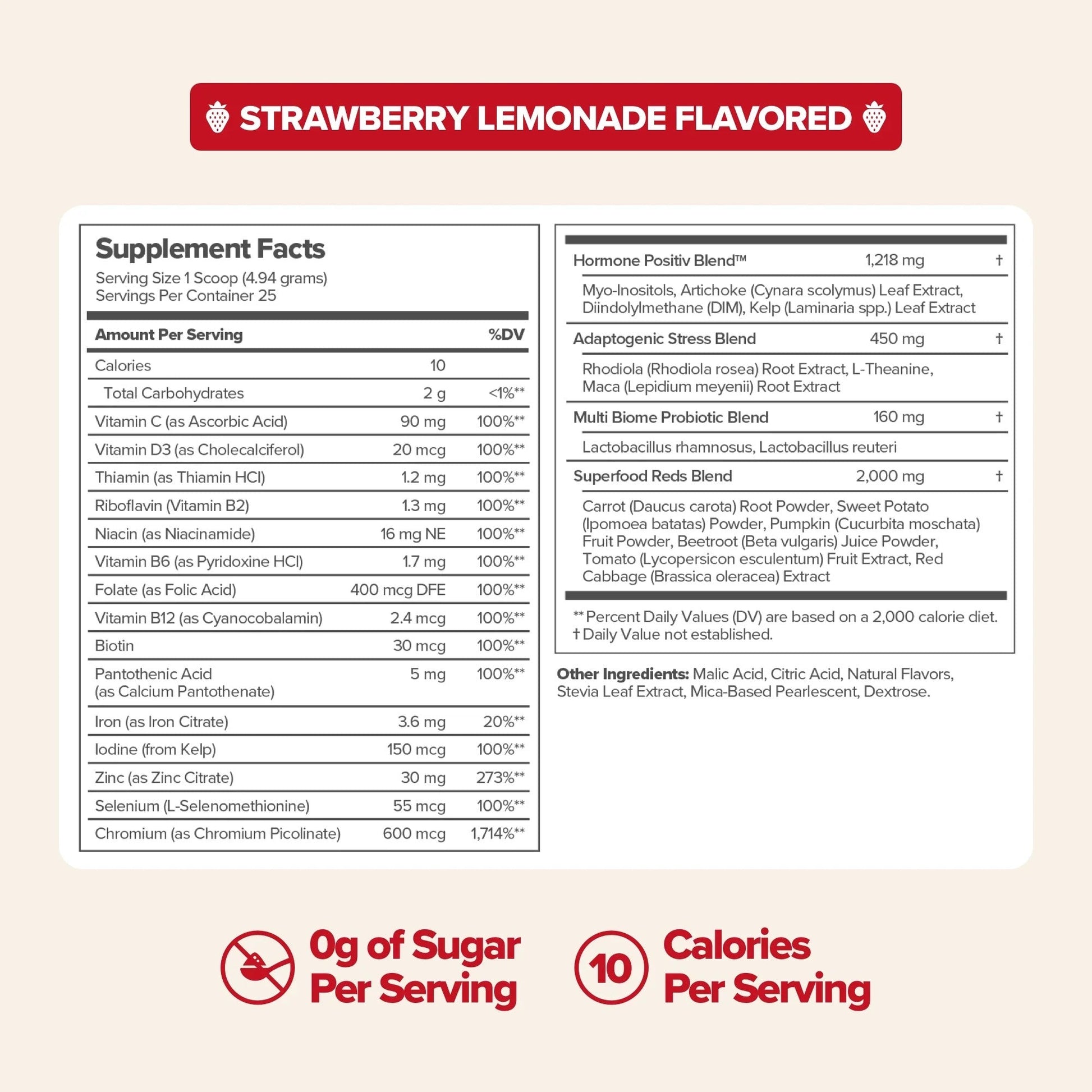 Serving Size: 1 scoop, 25 servings per container. Calories 10, Total Carbohydrates 3g, Vitamin C (as Ascorbic Acid) 90mg, Vitamin D3 (as Cholecalciferol) 20 mcg, Thiamin (as Thiamin HCI) 1.2 mg, Riboflavin (Vitamin B2) 1.3 mg, Niacin (as Niacinamide) 16 mg NE, Vitamin B6 (as Pyridoxine HCl) 1.7 mg, Folate (as Folic Acid) 400 mcg DFE, Vitamin B12 (as Cyanocobalamin) 2.4 mcg, Biotin 30 mcg, Pantothenic Acid (as Calcium Pantothenate) 5 mg, Iron (as Iron Citrate) 3.6 mg, Iodine (from Kelp) 150 mcg, Zinc (as Zinc Citrate) 30 mg, Selenium (L-Selenomethionine) 55 mcg, Chromium (as Chromium Picolinate) 600 mcg, Hormone Positiv Blend™: Artichoke (Cynara scolymus) Leaf Extract, Diindolylmethane (DIM), Kelp (Laminaria spp.) Leaf  Extract 626 mg, Adaptogenic Stress Blend: Rhodiola (Rhodiolarosea) Root Extract, L-Theanine, Maca (Lepidium meyenii) Root Extract 450 mg, Multi Biome Probiotic Blend: Lactobacillus rhamnosus, Lactobacillus reuteri 160 mg, Superfood Reds Blend: Carrot (Daucus carota) Root Powder, Sweet Potato (Ipomoea batatas) Powder, Pumpkin (Cucurbita moschata) Fruit Powder, Beetroot (Beta vulgaris) Juice Powder, Tomato (Lycopersicon esculentum) Fruit Extract, Red Cabbage (Brassica oleracea) Extract 1,977 mg